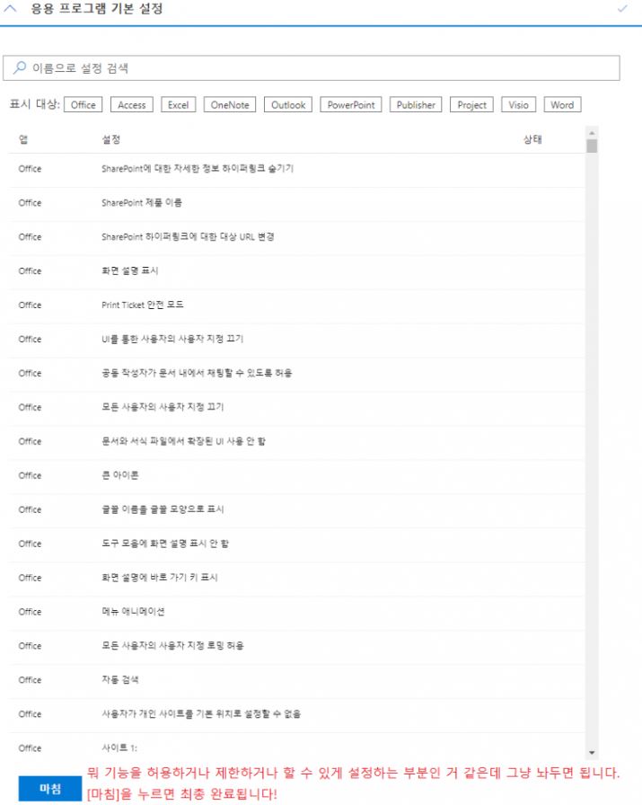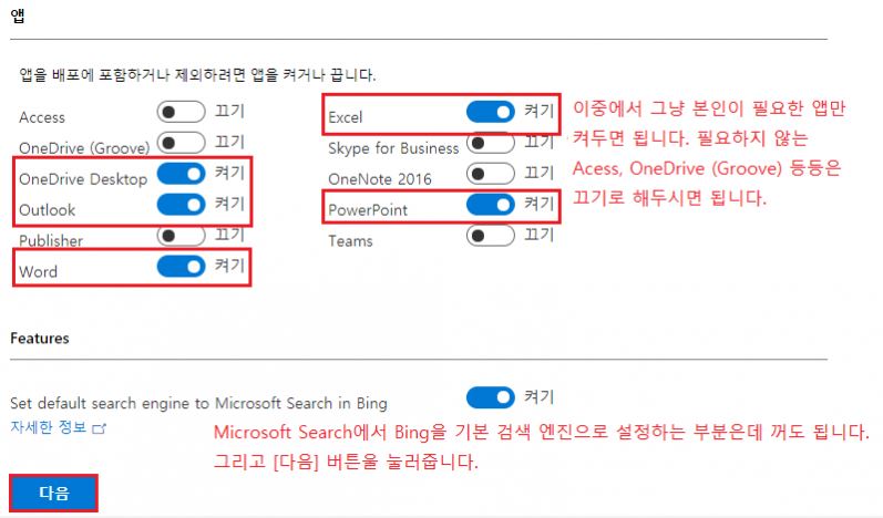 여기서부터는 자신이 쓰고 싶은 오피스 앱을 선택하는 곳이에요. 저같은 경우는 엑셀과 파워포인트 그리고 워드만 사용을 합니다.