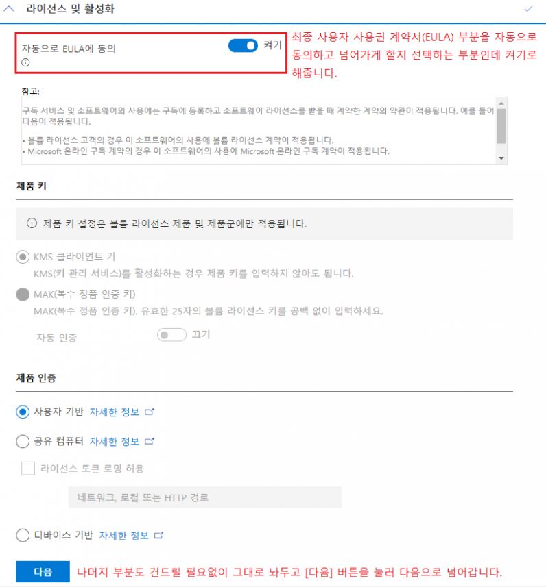 라이선스 및 활성화 하는 탭이 나오는데요. 자동으로 EULA에 동의 부분만 켜기로 바꿔 주시고 나머지는 그대로 두시면 됩니다.