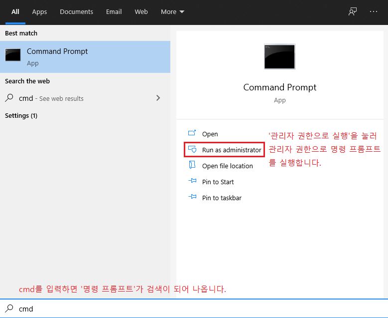 왼쪽 밑에 윈도우 표시 옆에 검색하기를 눌른 후에 cmd를 입력 하고 명령 프롬프트를 관리자 권한으로 실행을 시켜 줍니다.