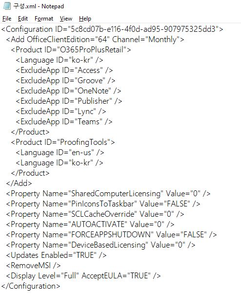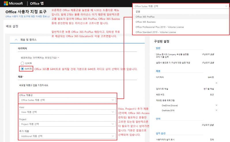 2. 오피스 사용자 지정 도구 사이트에서 구성.xml 파일을 만들고 내보내기