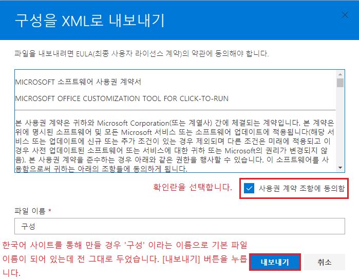 사용권 계약 조항에 동의를 체크해주시고 내보내기를 눌러주세요.