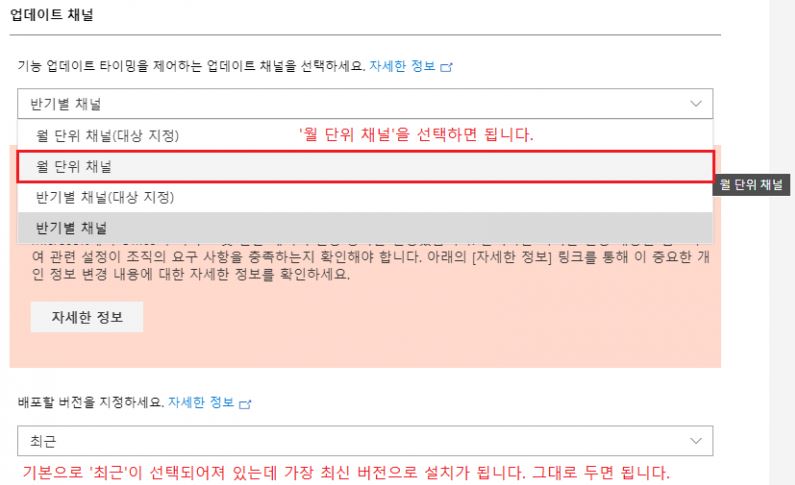 업데이트 채널은 월단위 채널로 선택을 해주세요. 배포할 버전은 최근으로 선택해 주시고요.